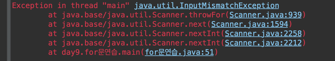 Programming/Error & Exception InputMismatchException cdv 2022. 11. 13. 21:43 에러 원인: 정수로 입력해야 하는데 문자를 입력한 경우 예외 발생 에러 해결 방법: try-catch문을 사용해서 예외처리 해주기 공유하기 게시글 관리 cochon_dev 'Programming/Error & Exception' Related Articles SQLIntegrityConstraintViolationException IndexOutOfBoundsException StackOverflow IllegalStateException, NoSuchElementException