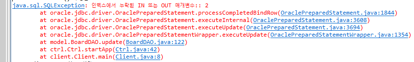 제 에러원인은 PreparedStatement를 사용하던 중에 2개의 값을 넣어줘야 하는데 한 개의 값만 입력해줘서 에러가 났다.